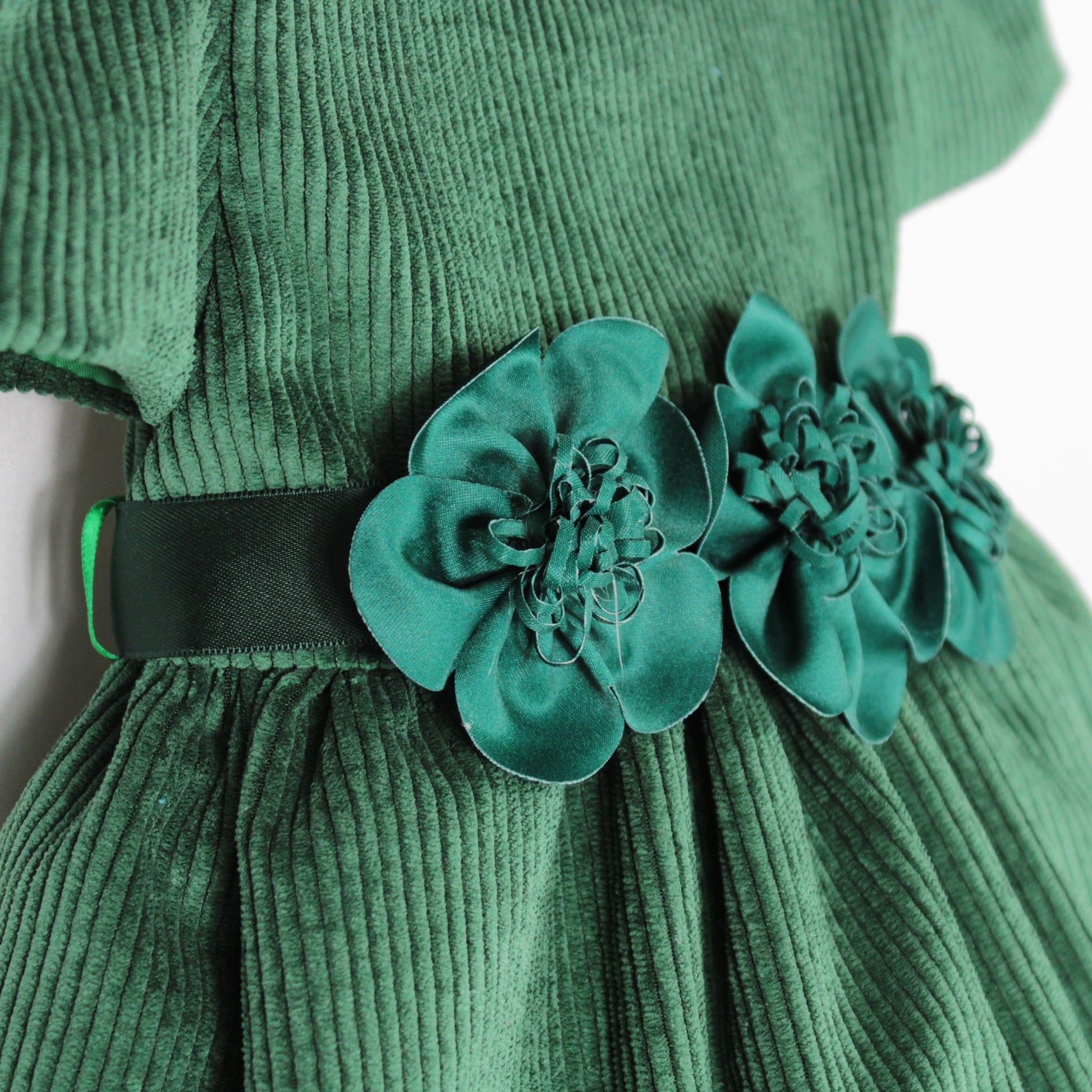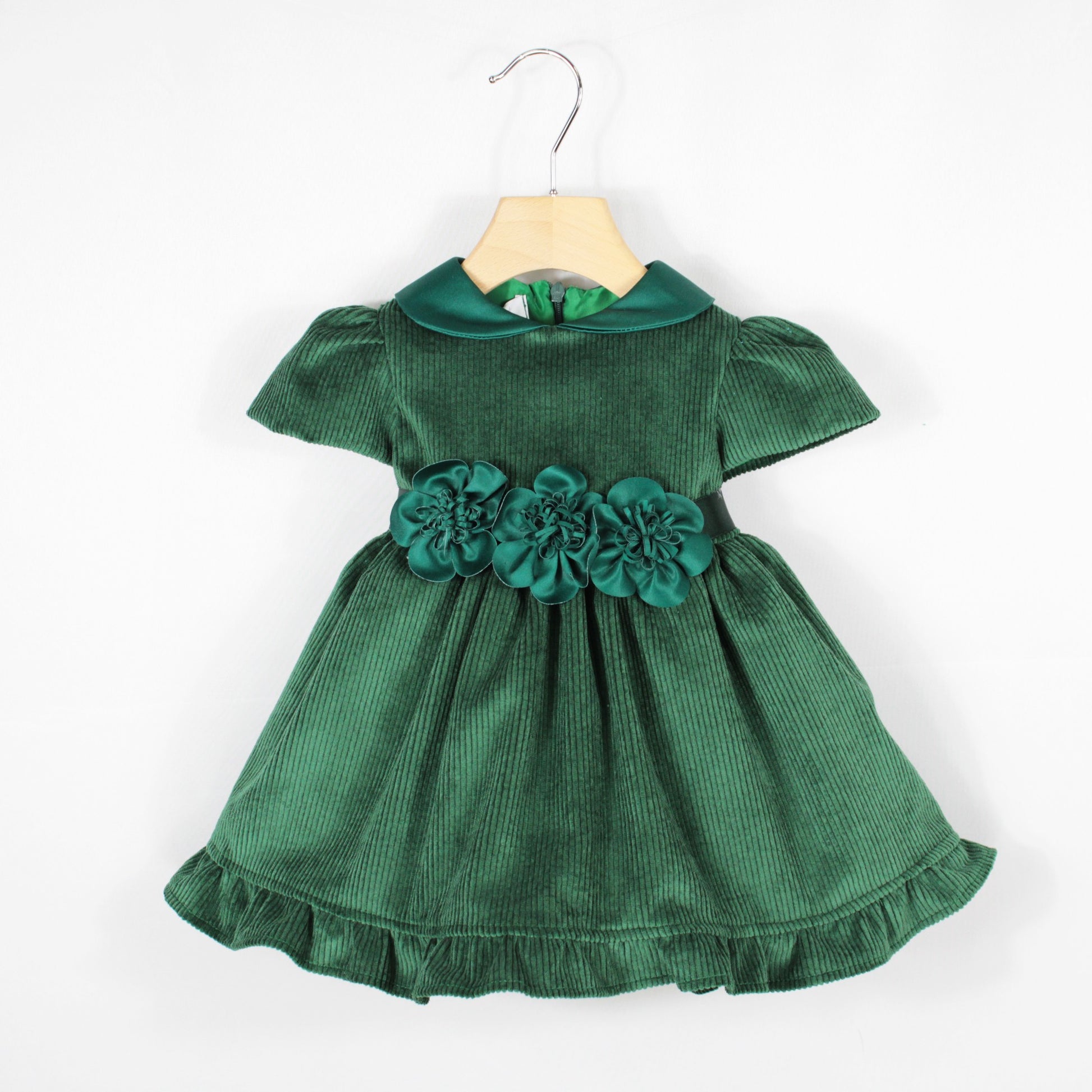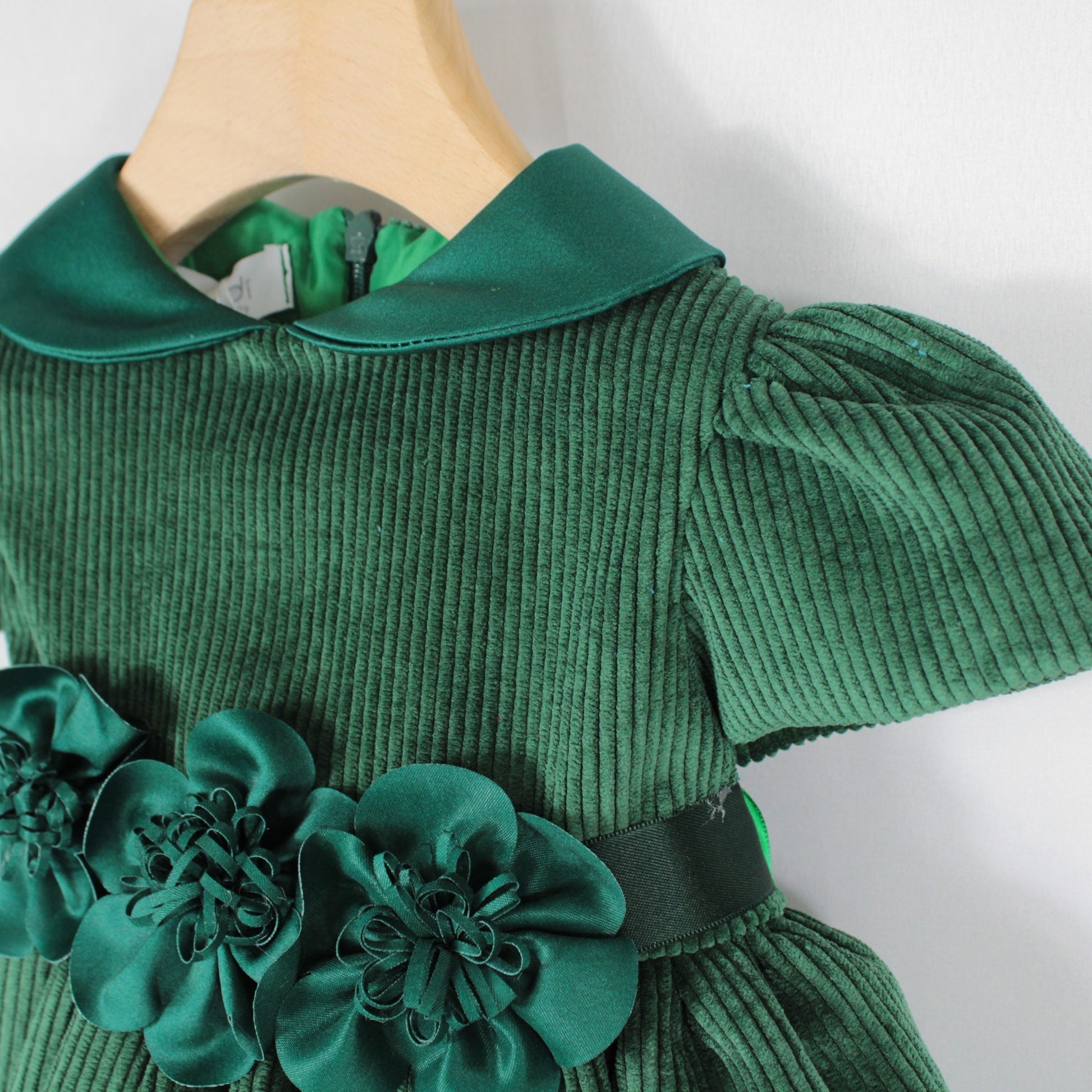 Vestito elegante in velluto a costine per neonata, realizzato con cura artigianale in Italia. La struttura morbida e pregiata è impreziosita da un delicato colletto e una cintura decorata con fiori, perfetti per occasioni speciali. La fodera interna in 100% cotone garantisce massimo comfort sulla pelle delicata del bambino, mentre la sottogonna in tulle aggiunge volume e movimento. Disponibile nei colori verde scuro, ceruleo e viola, per taglie 12-30 mesi. Composizione: 60% poliestere, 40% cotone. Un capo sofisticato che unisce qualità Made in Italy e praticità.