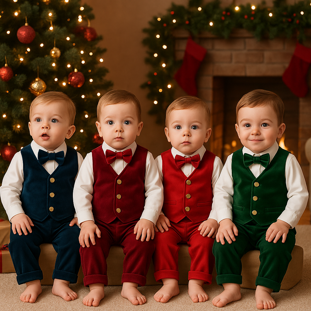 Completo natalizio elegante per neonato realizzato in Italia con velluto pregiato. Comprende gilet, papillon coordinato e pantalone abbinati a camicia in cotone a maniche lunghe. Arricchito da dettagli di bottoni dorati che conferiscono un tocco di raffinatezza. Disponibile nelle tonalità festive di rosso, verde, bordeaux e blu. Perfetto per occasioni speciali, offre comfort e stile per i piccoli da 9 a 30 mesi. Composizione: 100% poliestere.