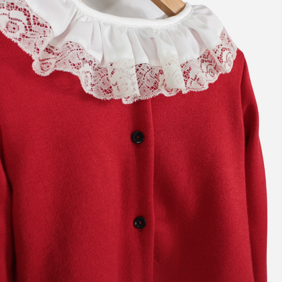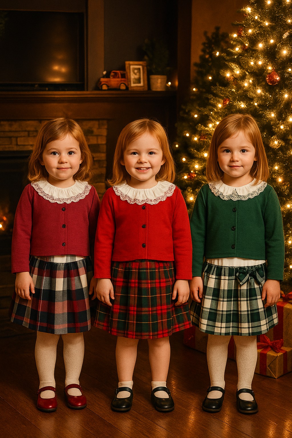 Completo natalizio elegante e raffinato per bambina, perfetto per le festività. Composto da cardigan in morbido tessuto con bottoni, camicia con dettaglio collo e gonna in effetto tartan. La sottogonna in tulle aggiunge volume e movimento, mentre la federa in cotone garantisce comfort. Realizzato in Italia con materiali di qualità: poliestere, viscosa, poliammide ed elastan. Disponibile nella combinazione cromatica rosso e verde, per un look festivo e coordinato. Taglie 3-7 anni.