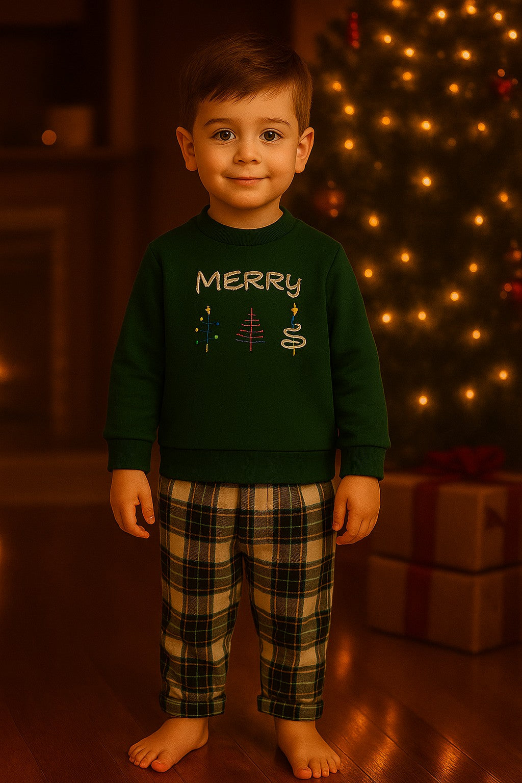 Completo natalizio elegante per neonato composto da pullover con stampa e pantalone tartan in tonalità verde. Il pullover combina viscosa, poliestere e poliammide per morbidezza e praticità, mentre il pantalone in poliestere, viscosa ed elastane garantisce comfort e libertà di movimento. Perfetto per le occasioni speciali, questo set Made in Italy è disponibile nelle taglie 6-24 mesi. Una scelta raffinata per vestire il tuo bambino con stile durante le festività.