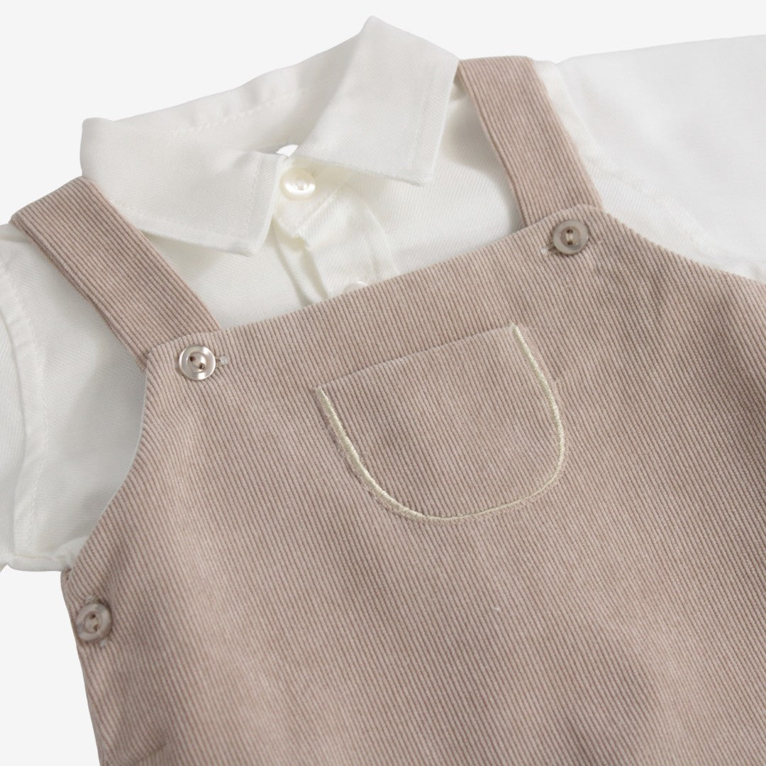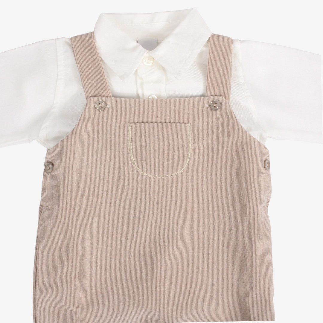 Completo neonato composto da pantalone a bretelle, camicia e giacchina, ideale per occasioni speciali. Il pantalone, realizzato in un mix resistente di poliestere, nylon e spandex, garantisce comfort e libertà di movimento. La camicia in 100% cotone assicura freschezza e morbidezza a contatto con la pelle delicata del bambino. La giacchina, in lana e acrilico, offre calore e protezione senza rinunciare alla leggerezza. Disponibile in colore celeste e nelle taglie 6, 9 e 12 mesi. Prodotto interamente in Italia, per qualità certificata e cura sartoriale.