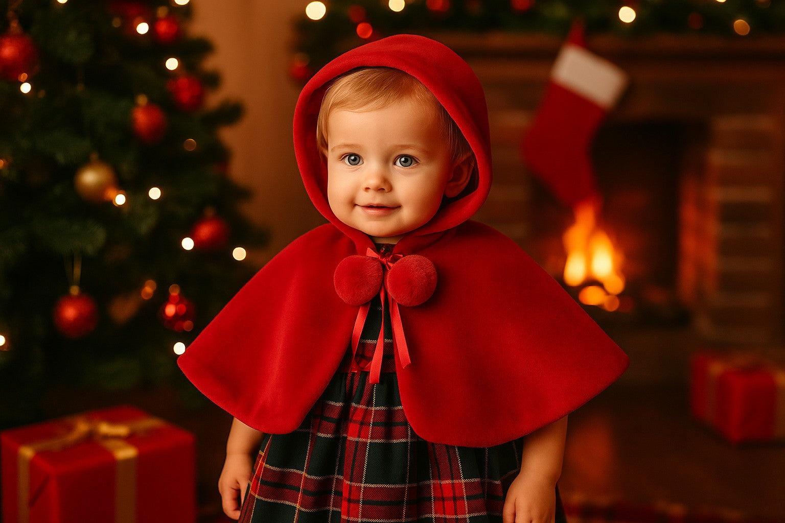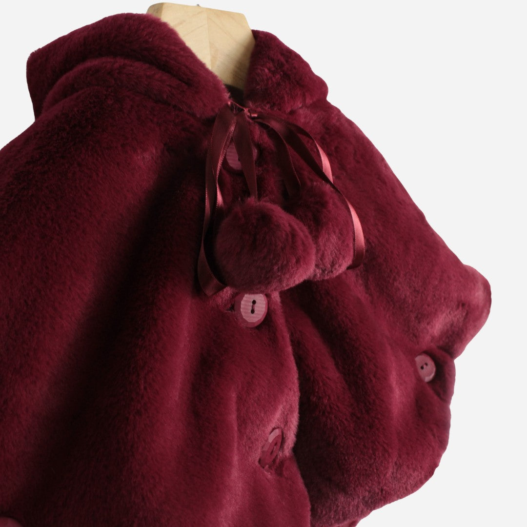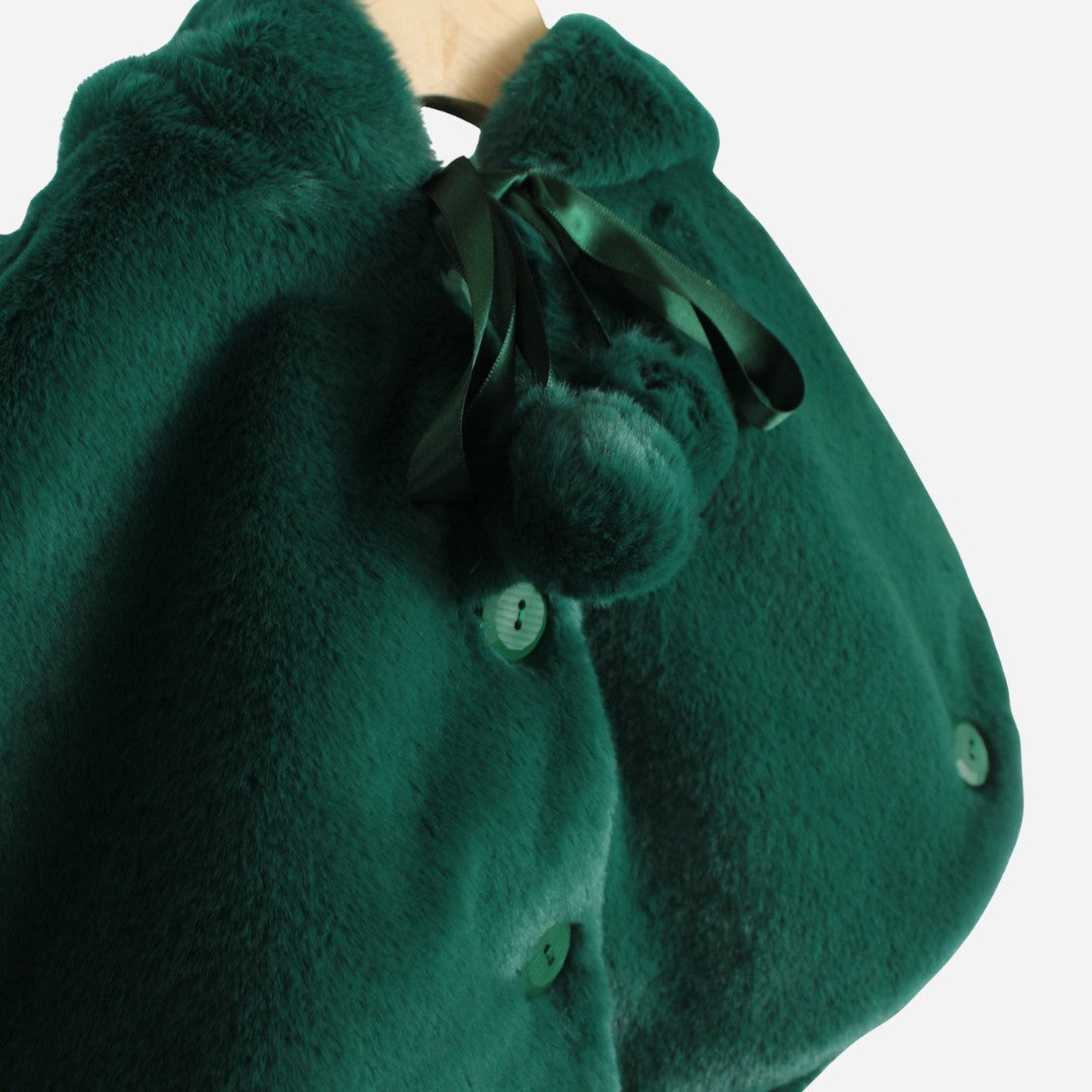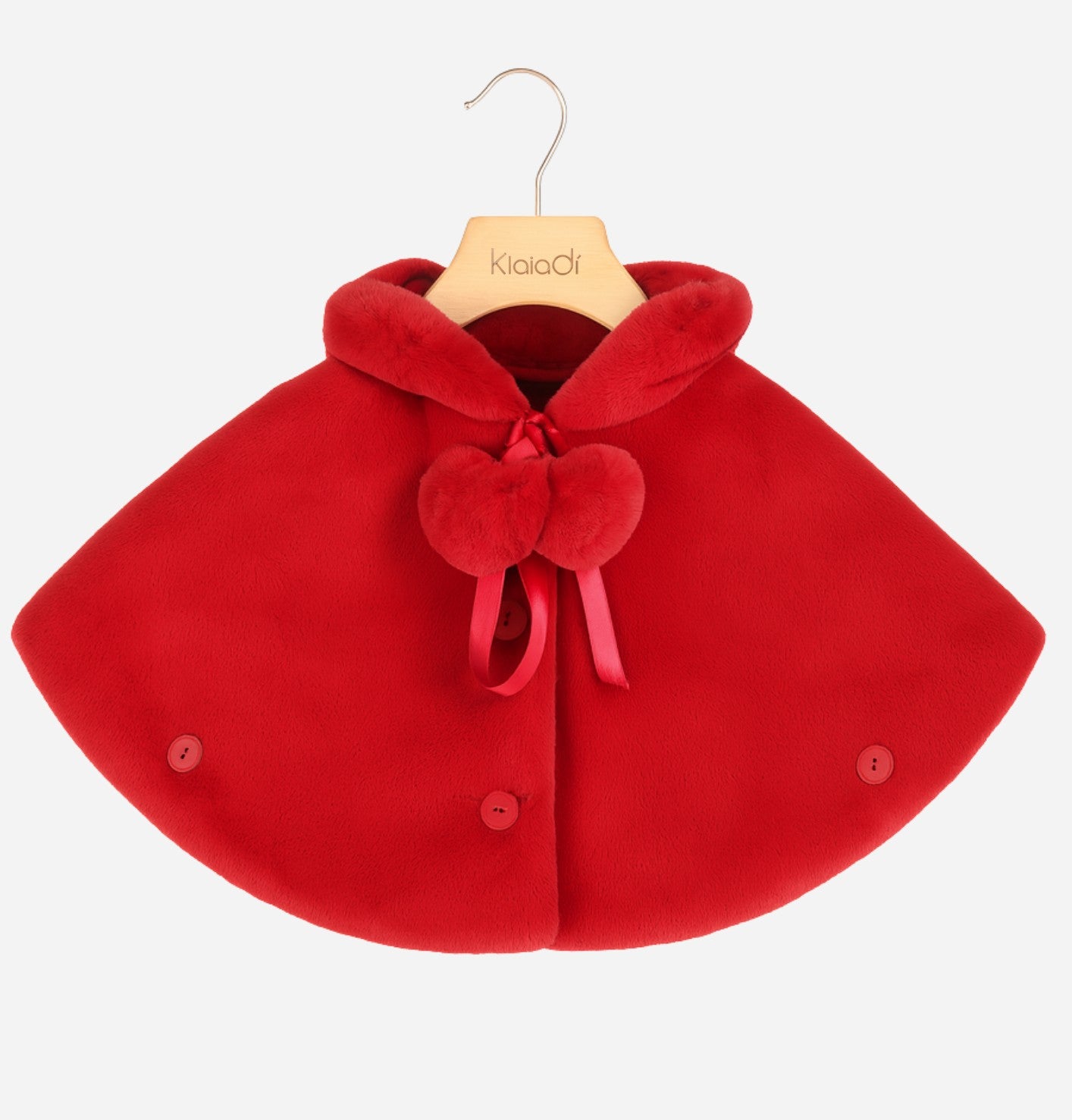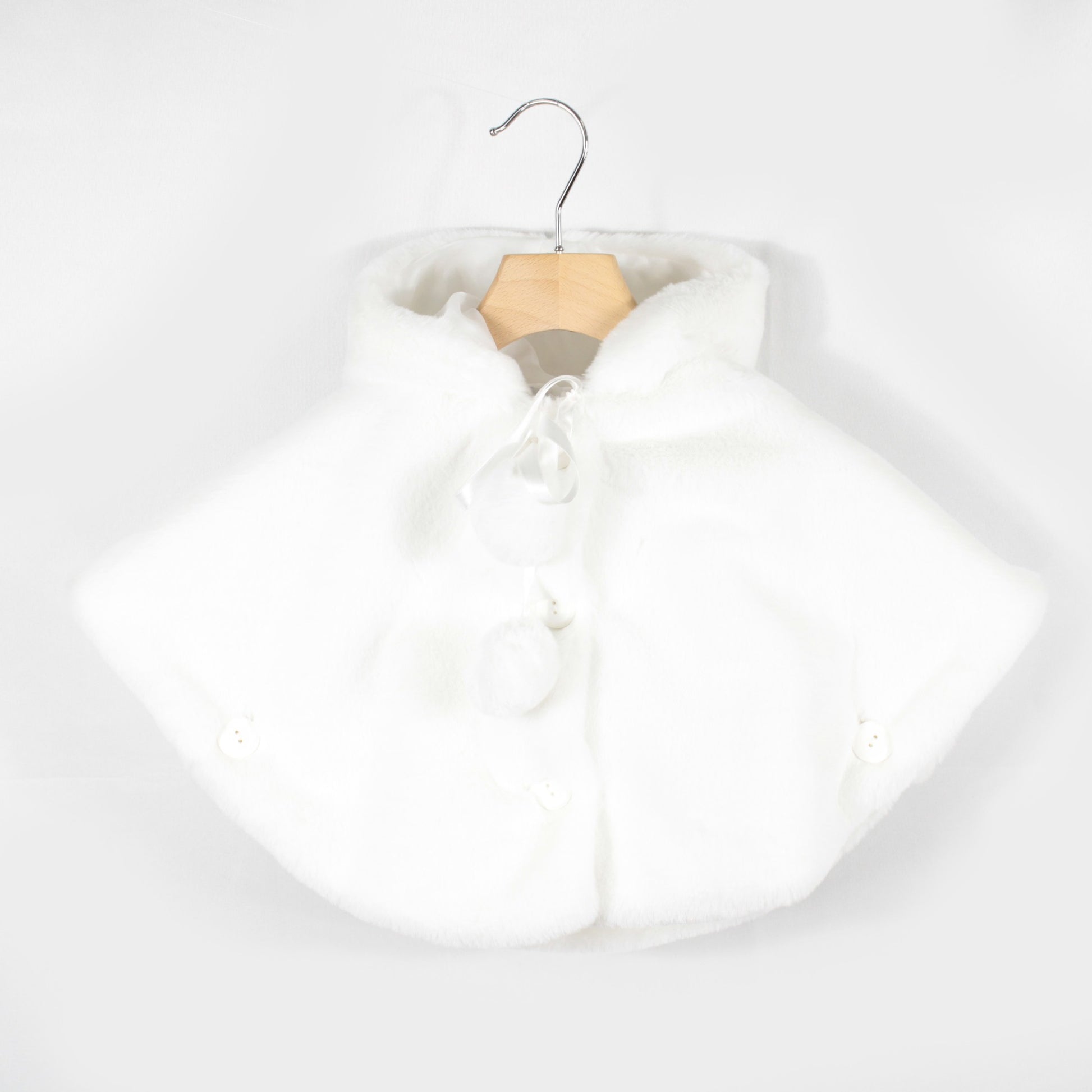 Mantellina elegante in eco pelliccia per neonata, realizzata con materiali di qualità: 80% poliestere e 20% viscosa. Caratterizzata da un cappuccio accogliente, dettagli decorativi con pon pon e bottoni che aggiungono un tocco di stile. Disponibile in cinque tonalità raffinate: panna, rosa, rosso, bordeaux e verde. Taglie dalla nascita fino ai 30 mesi per accompagnare la crescita del bambino. Prodotto Made in Italy, garantisce comfort e praticità per le giornate più fredde.
