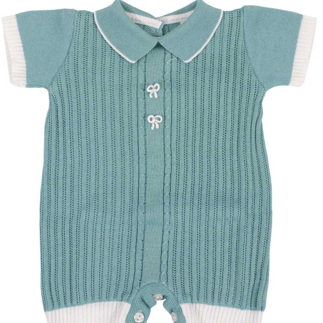 Delicato pagliaccetto neonato realizzato in puro cotone, ideale per i primi mesi di vita. Caratterizzato da ricami a fiocco e fasce in contrasto che aggiungono eleganza al design. La lavorazione in filo di cotone garantisce morbidezza e traspirabilità, essenziali per la pelle sensibile del neonato. Disponibile nelle taglie 0 (0/1 mese) e I (1/3 mesi) nella combinazione cromatica smeraldo e bianco. Prodotto Made in Italy con la qualità e l'attenzione ai dettagli che contraddistinguono l'eccellenza della manifattura italiana.