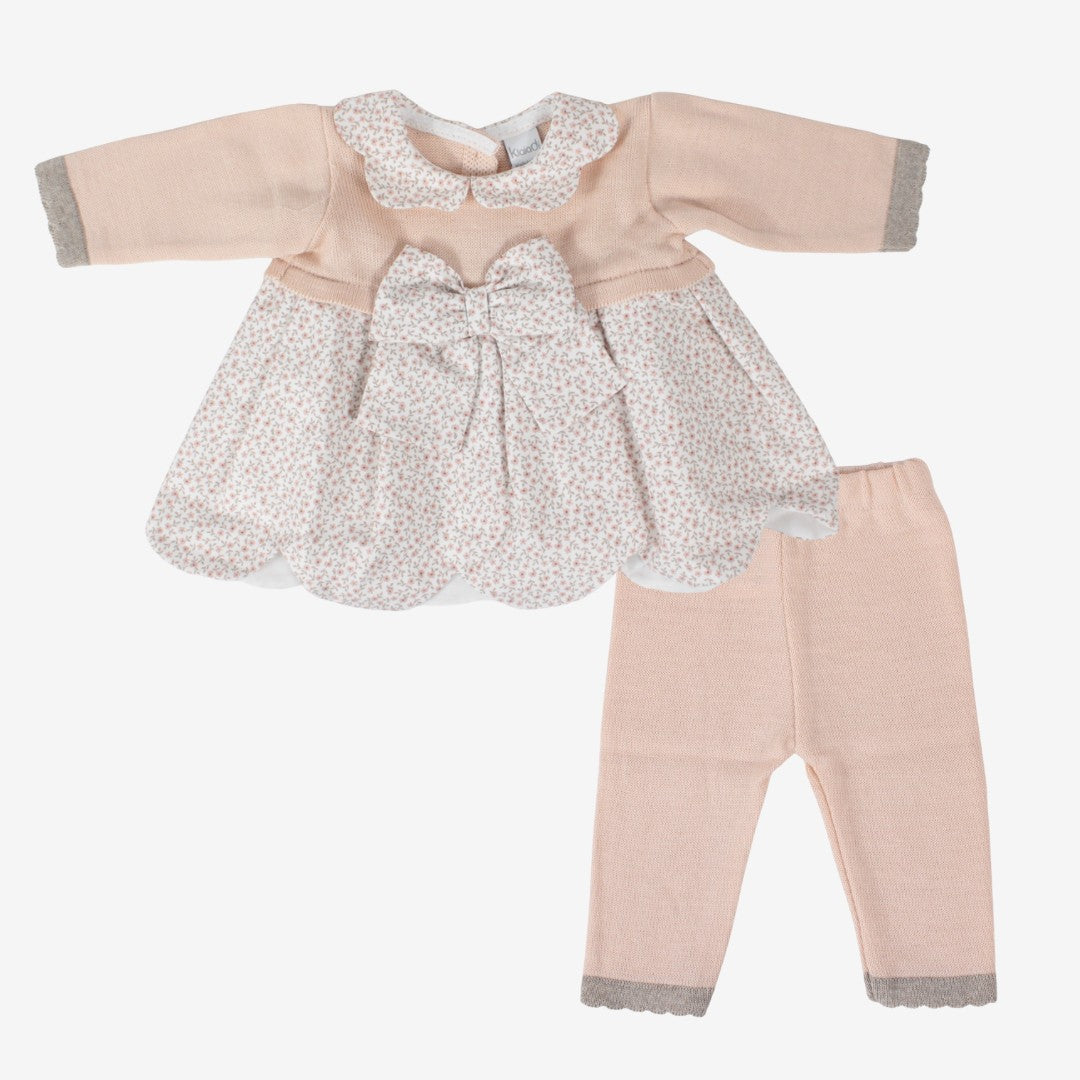 Completo corredino per neonata composto da vestina in lana e tessuto strutturato abbinata a leggings lunghi. Realizzato in Italia con una raffinata miscela di 50% lana e 50% acrilico, garantisce morbidezza e calore, ideale per mantenere la piccola confortevole nelle stagioni più fresche. Il colore cipria tortora dona un tocco elegante e delicato. Disponibile nelle taglie 0 (0/1 mese) e I (1/3 mesi), questo completo unisce stile e funzionalità per la prima infanzia.