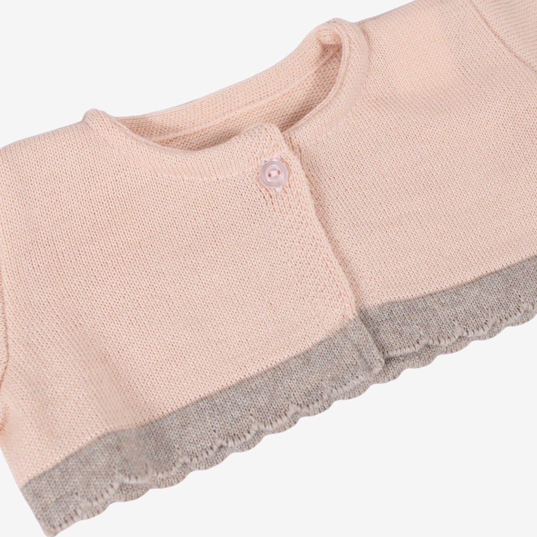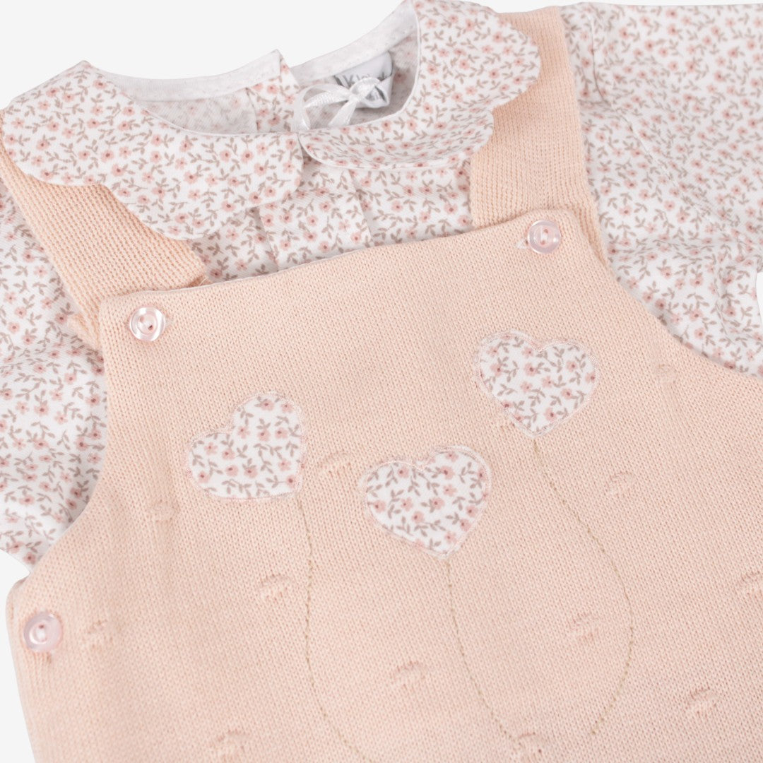 Completo neonata composto da salopette decorata abbinata a camicetta con fantasia floreale e coprispalle in cotone, nel raffinato colore cipria tortora. Disponibile nelle taglie 0 (0/1 mese) e I (1/3 mesi), questo set è realizzato in Italia con materiali di qualità: salopette e camicetta in misto lana e acrilico (50% lana, 50% acrilico) per garantire calore e comfort, e coprispalle in cotone 100% per una delicata protezione. Perfetto per vestire la tua piccola con stile ed eleganza anche nei primi mesi.