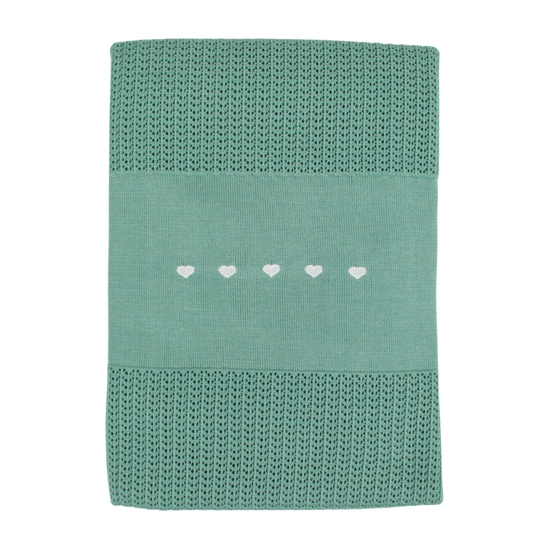 Coperta neonata realizzata in puro cotone, ideale per avvolgere il bambino con morbidezza e delicatezza. Caratterizzata da un elegante ricamo a forma di cuore, questa coperta combina funzionalità e stile. Il colore sedano neutro si adatta perfettamente a qualsiasi ambiente. Prodotta interamente in Italia con materiali di qualità, garantisce comfort e traspirabilità. Taglia unica, perfetta come regalo o per l'uso quotidiano.