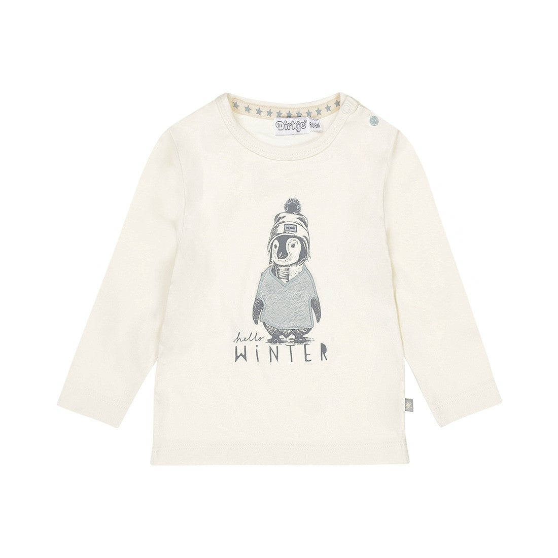 Morbida maglietta a maniche lunghe per neonato della collezione Dirkje, realizzata in tessuto di qualità con tinta unita. Il design è arricchito da una simpatica stampa di pinguino sul petto che cattura lo sguardo. La pratica chiusura a bottoni sulla spalla facilita il cambio del piccolo, garantendo comodità e praticità durante le operazioni quotidiane. Perfetta per le stagioni più fredde, combina stile e funzionalità per il tuo neonato.